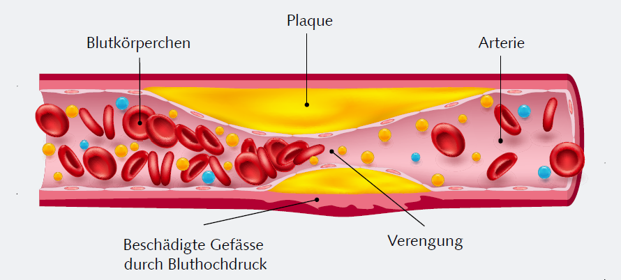 Herz-Kreislauf-Erkrankungen entstehen, indem sich Lipide und Kalk an den Gefässwänden festhalten und ansammeln. Dies wird begünstigt durch Bluthochdruck, da der dauerhaft hohe Druck die Gefässe schädigen kann, weshalb sich die Lipide und der Kalk noch besser festhalten können. Diese Ansammlungen behindern den Blutfluss bis zur totalen Verstopfung. Dies führt zu einem Blutgerinnsel, welches sich lösen kann und den Weg ins Gehirn oder ins Herz findet, wo es einen Infarkt auslösen kann.