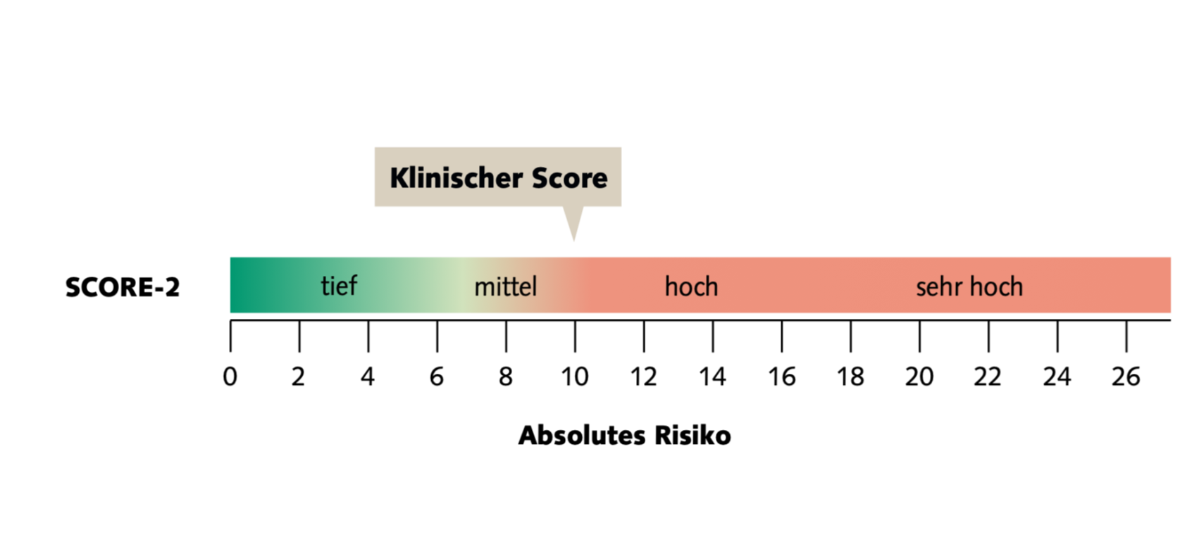 Das klinische Risiko wird mit dem länderspezifischen SCORE-2 berechnet. Faktoren, die berücksichtigt werden sind Alter, Geschlecht, Rauchen, totales Cholesterin, HDL-Cholestrin, Triglyceride, LDL-Ccholesterin. Weitere Risikofaktoren wie Lipoprotein(a) oder autoimmun-chronische Krankheiten berücksichtigen die Ärzt:innen individuell. Der wissenschaftlich bestätigte Score basiert auf dem absoluten Risiko, das 10-Jahres-Risiko für das erstmalige Auftreten von Herz-Kreislauf-Erkrankungen (Herzschlag und Hirnschlag gravierend und nicht gravierend) in der europäischen Bevölkerungen vorherzusagen.